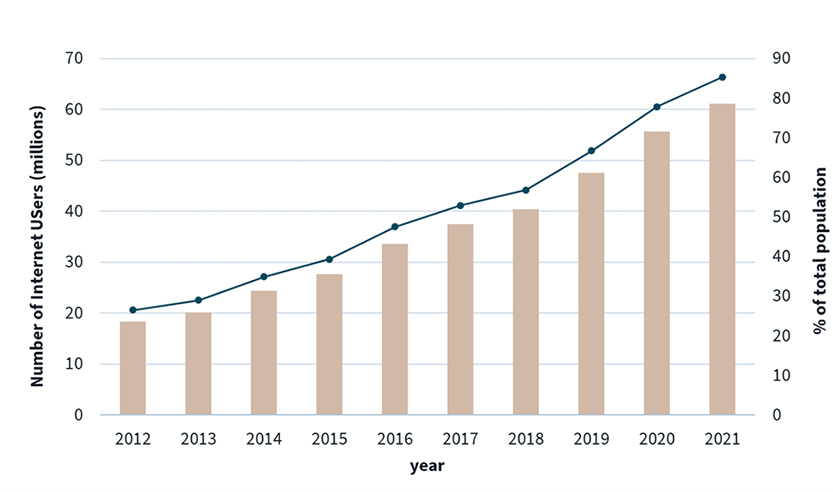 ภาพที่ 1: จำนวนผู้ใช้อินเทอร์เน็ตในประเทศไทย พ.ศ. 2012-2021