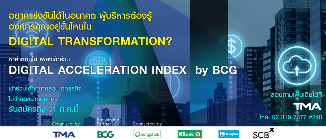 กรุงเทพฯ : 11 กรกฎาคม 2566 – ในโลกที่เทคโนโลยีดิจิทัลกลายเป็นเครื่องมือสำคัญในการบริหารจัดการและสร้างธุรกิจให้เติบโต องค์กรที่มีความพร้อมคือผู้ที่จะฝ่าด่านการแข่งขันได้และมีโอกาสการสร้างรายได้แบบก้าวกระโดด เพื่อสนับสนุนการสร้างขีดความสามารถในการแข่งขันด้านดิจิทัลในประเทศไทย สมาคมการจัดการธุรกิจแห่งประเทศไทย (TMA) ขอเชิญชวนองค์กรในทุกภาคส่วน ร่วมประเมินความพร้อมเกี่ยวกับ Digital Transformation (การเปลี่ยนผ่านองค์กรสู่ดิจิทัล) ด้วยเครื่องมือลิขสิทธิ์ Digital Acceleration Index (DAI) ของ Boston Consulting Group (BCG) องค์กรที่ปรึกษาทางธุรกิจระดับโลก
