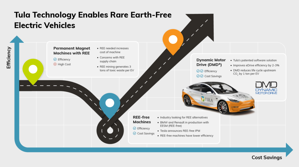 เป็นเรื่องที่ดีที่การพัฒนาวิธีการควบคุมมอเตอร์ไฟฟ้าแบบใหม่ สามารถปรับปรุงยานยนต์ไฟฟ้าที่ไม่ใช้แม่เหล็กถาวรให้มีประสิทธิภาพสูงขึ้นได้ ด้วยเทคโนโลยี Dynamic Motor Drive (DMD®) ซึ่งใช้อัลกอริทึมการควบคุมที่เป็นกรรมสิทธิ์ของ Tula ส่งผลให้เกิดประสิทธิภาพอยู่ในระดับแนวหน้าในทางอุตสาหกรรมเมื่อทำงานร่วมกับมอเตอร์ซิงโครนัสแบบกระตุ้นจากภายนอก (externally excited synchronous motors; EESM) ซึ่งมอเตอร์ประเภทนี้เลี่ยงการใช้แม่เหล็กถาวรไปอย่างสิ้นเชิง และผู้ผลิต OEM ทั่วโลก ต่างกำลังดำเนินการด้วยวิธีนี้ เพื่อหลีกเลี่ยงการใช้องค์ประกอบของธาตุหายาก และต้องการลดต้นทุนของระบบ ที่สำคัญ DMD ช่วยปรับปรุงประสิทธิภาพของระบบส่งกำลังที่ปราศจากธาตุหายากเหล่านี้ให้อยู่ในระดับที่เหนือกว่ามอเตอร์แบบแม่เหล็กถาวรที่ดีที่สุด