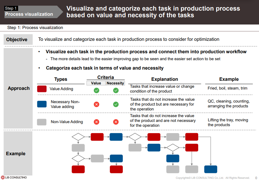 1. Visualization ประเมินภาพรวมและวิเคราะห์ Workflow ทั้งหมดของธุรกิจ ซึ่งจุดสำคัญ คือ การประเมินภาพรวมก่อน แล้วจึงมองแบบวิเคราะห์ให้ละเอียด โดยเฉพาะจุดที่ใช้แรงงานเยอะ