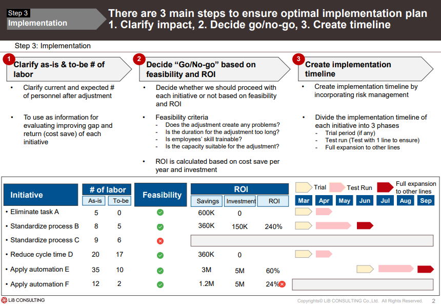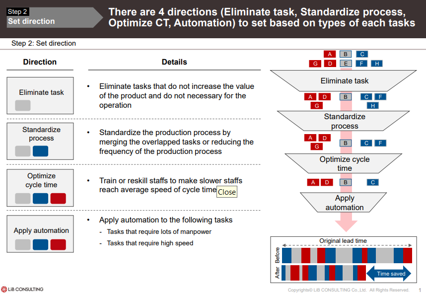2. Direction setting ออกแบบและกำหนดแนวทางในการปรับปรุง Workflow ให้กระบวนการทำงานขององค์กรมีประสิทธิภาพมากขึ้น ซึ่งจุดสำคัญ คือ การคิดจากผลลัพธ์ที่จะได้ว่าสร้าง Value มากแค่ไหนให้กับธุรกิจบ้าง และ Impact ของการลด Output แต่ละส่วนไปจะส่งผลมากน้อยเพียงใดกับธุรกิจ