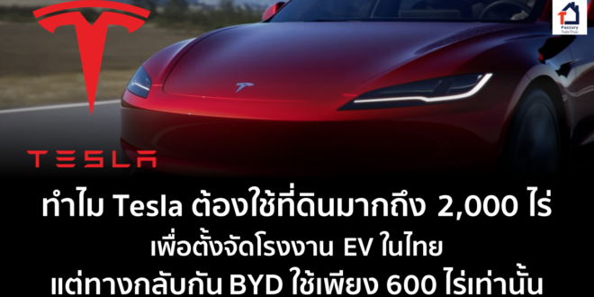 Tesla ต้องการที่ดินมากถึง 2,000 ไร่ หากจะให้พวกเขาลงทุนในการผลิตรถยนต์ไฟฟ้า EV ในประเทศไทย แต่การวางผังเมืองอาจจะไม่สนับสนุน โดย Tesla กำลังพิจารณาที่ดินในเขตลาดกระบัง แต่ก็ยังต้องรอดูว่าข้อตกลงจะสามารถปิดได้โดยไม่ก่อให้เกิดปัญหาเรื่องการวางผังเมืองหรือไม่ และอาจส่งผลต่อความล่าช้าที่จะเริ่มต้นสร้างโรงงาน การเผชิญกับความท้าทายในการวางผังเมืองนี้ ตามที่นายกรัฐมนตรีกล่าวว่า ในไตรมาสแรกของปีนี้ Tesla คาดว่าจะประกาศว่าจะตั้งโรงงานในประเทศไทย แผนการของ Tesla ผู้ผลิตรถยนต์ในสหรัฐฯ ที่จะจัดตั้งโรงงานผลิตรถยนต์ไฟฟ้าในประเทศไทย กำลังเผชิญกับความล่าช้าที่อาจเกิดขึ้น เนื่องจากความท้าทายในการวางผังเมือง Tesla ได้ติดตามการประชุมของสหรัฐฯ กับเศรษฐา โดยการเยี่ยมชมสถานที่ที่มีศักยภาพในการสร้างโรงงาน ทำเนียบรัฐบาลรายงานว่า นายกเศรษฐาได้สั่งให้รัฐมนตรีว่าการกระทรวงอุตสาหกรรม หารือกับกรมโยธาธิการและผังเมือง กระทรวงมหาดไทย เพื่อหารือเกี่ยวกับประเด็นการวางผังเมืองอุตสาหกรรม ความเคลื่อนไหวนี้เกิดขึ้นหลังจากนักลงทุนบ่นว่าขาดการสนับสนุนโครงการที่เกี่ยวข้องกับการวางผังเมืองอุตสาหกรรมตั้งแต่ปลายปีที่แล้ว Tesla เคยกล่าวว่า ได้เรียนรู้ประสบการณ์การดำเนินการผลิตในโรงงานที่ประเทศจีน ทำให้รู้ว่าการจัดตั้งโรงงานบนที่ดิน 2,000 ไร่ จะทำให้มีความคล่องตัวมากกว่า อย่างไรก็ตาม หากสังเกตโรงงานของ BYD กลับใช้ที่ดินเพียง 600 ไร่เท่านั้น น้อยกว่าที่ Tesla ต้องการกว่า 3 เท่าตัว ที่มา : https://www.nationthailand.com/business/automobile/40036307