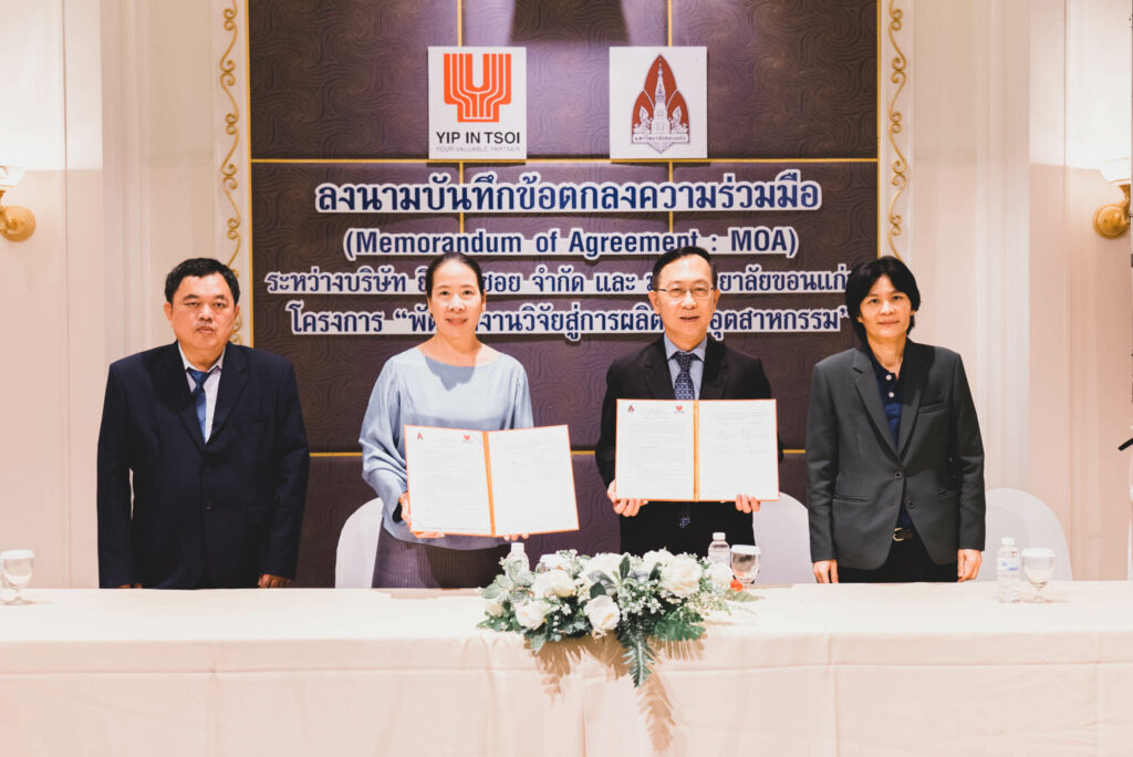 3 ธันวาคม 65 – คุณมรกต ยิบอินซอย กรรมการผู้จัดการใหญ่ และประธานเจ้าหน้าที่บริหาร บริษัท ยิบอินซอย จำกัด (ที่ 2 จากซ้าย) ลงนามบันทึกข้อตกลงความร่วมมือ (MOA) กับรองศาสตราจารย์ชาญชัย พานทองวิริยะกุล อธิการบดี มหาวิทยาลัยขอนแก่น (ที่ 2 จากขวา) ในโครงการ “พัฒนางานวิจัยสู่การผลิตภาคอุตสาหกรรม” เพื่อนำแบตเตอรี่ลิเธียมไอออนของโรงงานแบตเตอรี่ ไปใช้ในภาคอุตสาหกรรม และอุปกรณ์รถจักรยานยนต์ไฟฟ้า แบรนด์ RYN (อาร์วายเอ็น) ของกลุ่มบริษัท ยิบอินซอย จำกัด